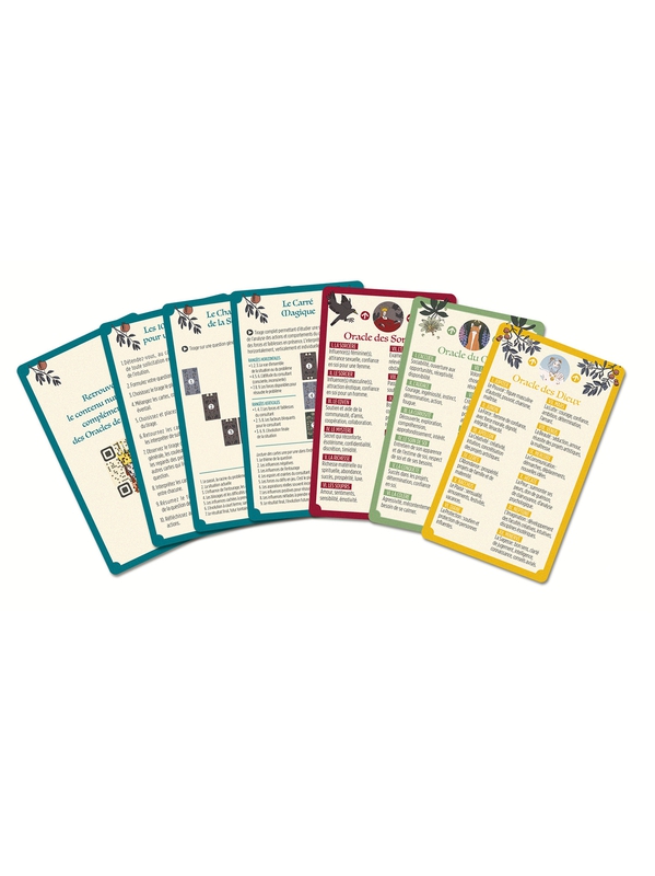 Ce Coffret comprend : 93 cartes. L’Oracle complet de 78 cartes comportant 3 Oracles de 26 cartes chacun. Les 3 oracles peuvent être utilisés individuellement, tous ensemble ou mixés à volonté. 15 Fiches pratiques de mots-clés de chaque oracle avec leurs significations positives et négatives et 10 propositions de tirage. Elles permettent une prise en main immédiate du jeu et en support lors de lecture de tirages. Un QR code renvoie vers un contenu numérique interactif complémentaire de 167 pages consultable sur téléphone.